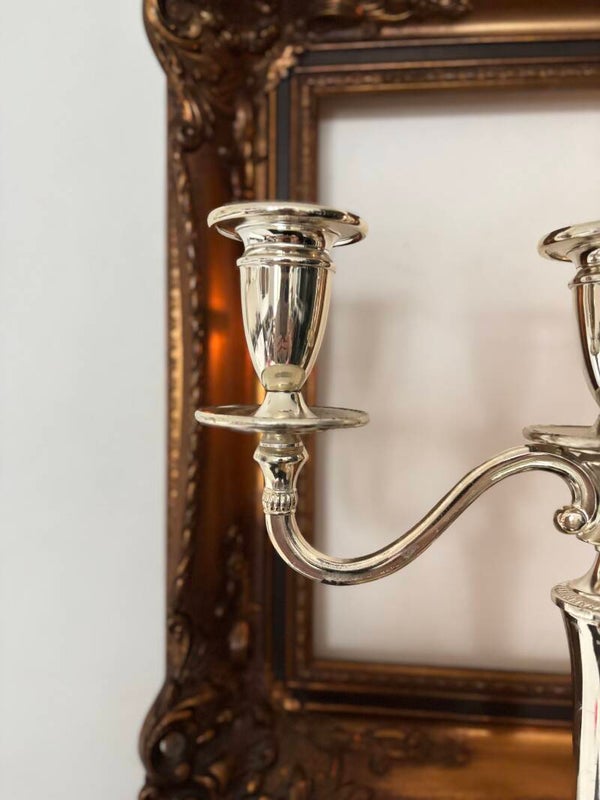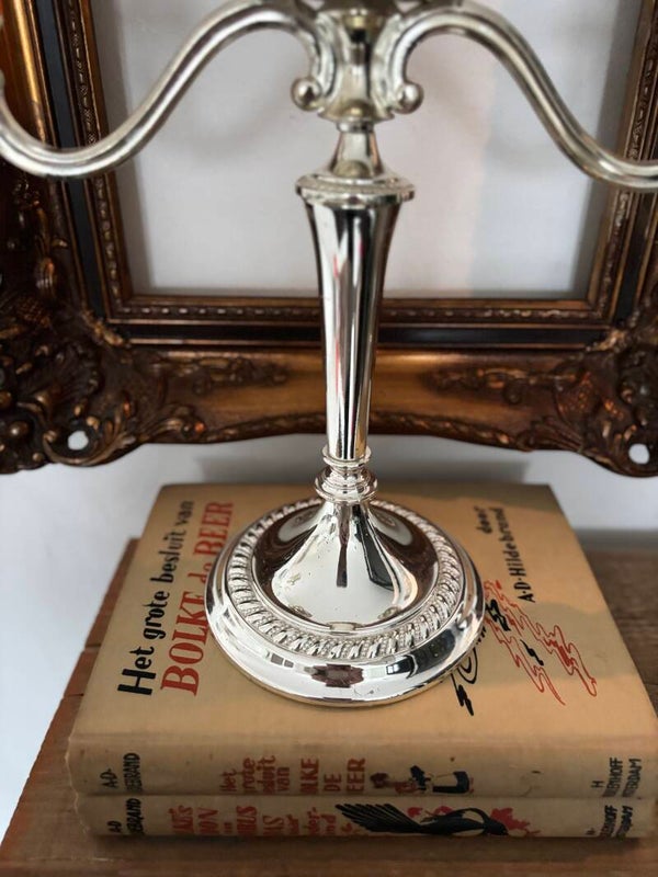 Verzilverde kandelaar met 3 armen. Met mooi patroon verwerkt, heel mooi voor op de kersttafel!