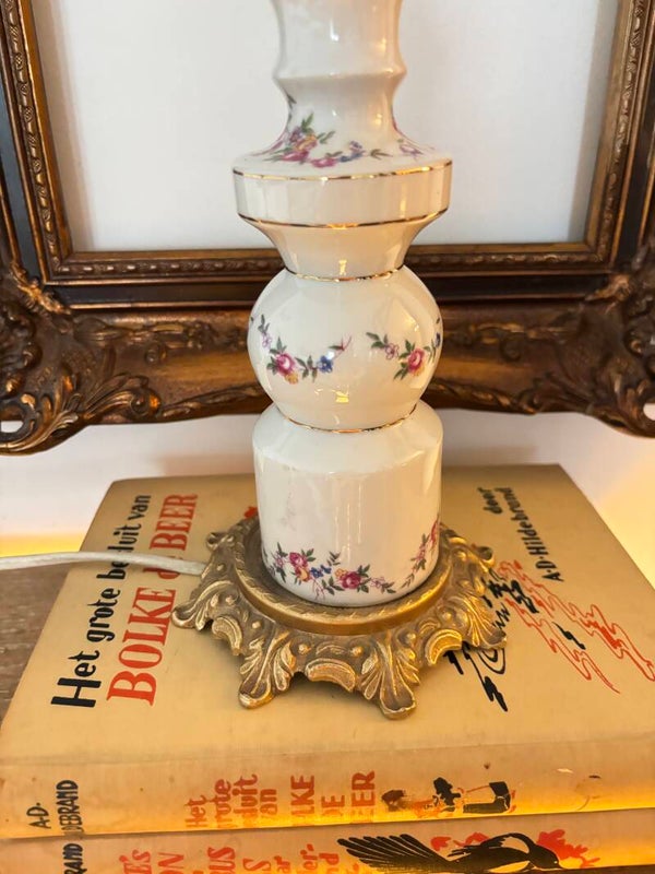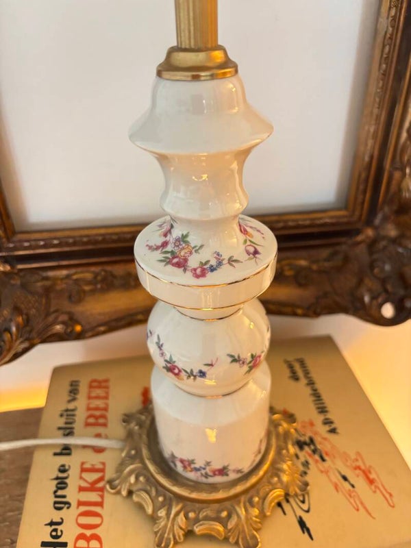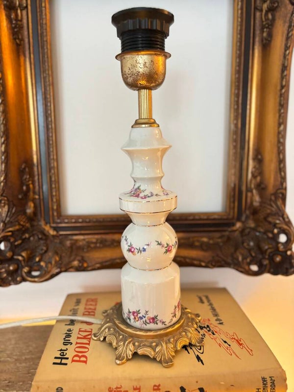 Porseleinen lampvoet met bloemen. Het prachtig bewerkte messing voetje maakt 'm helemaal af!