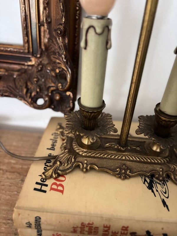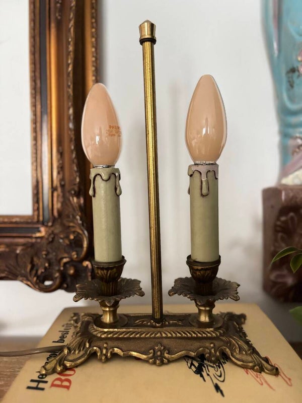 Vintage lampvoet met plek voor 2 lampjes. Kies voor kaarsvormige lampjes en dit lampje kan zo ergens gestyled worden! De gouden kleur en bewerking maakt het lampje een ware eyecatcher.