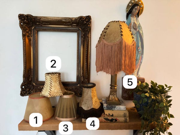 Vintage lampenkapjes van varkensblaas. Zie tweede foto voor de nummering.