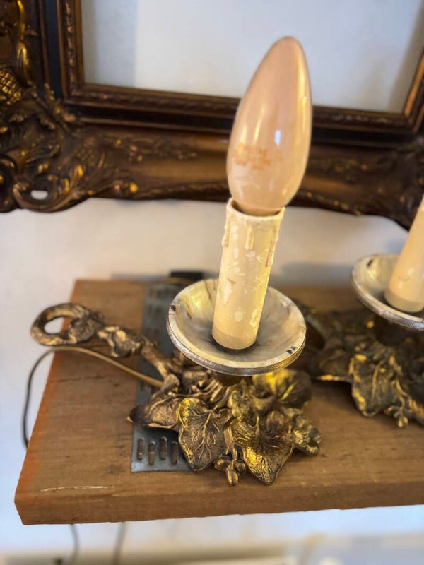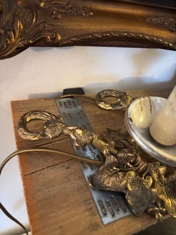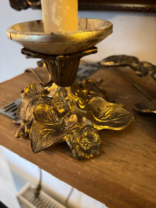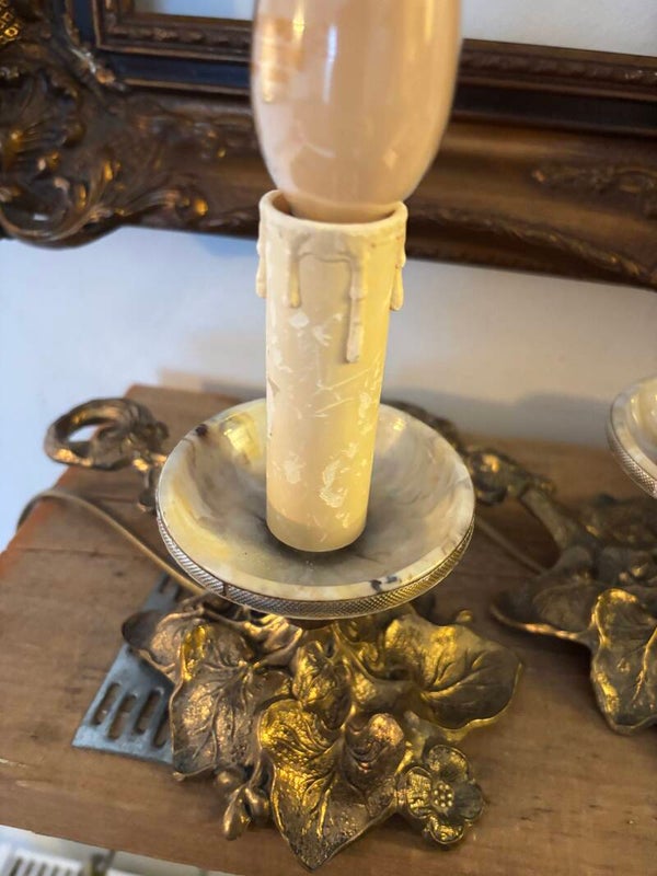 Prachtige art nouveau tafellampjes. Gemaakt van messing en wat een te mooie bewerking er in. De fitting is afgewerkt met kaars en marmeruil bakje. Prijs is per stuk.