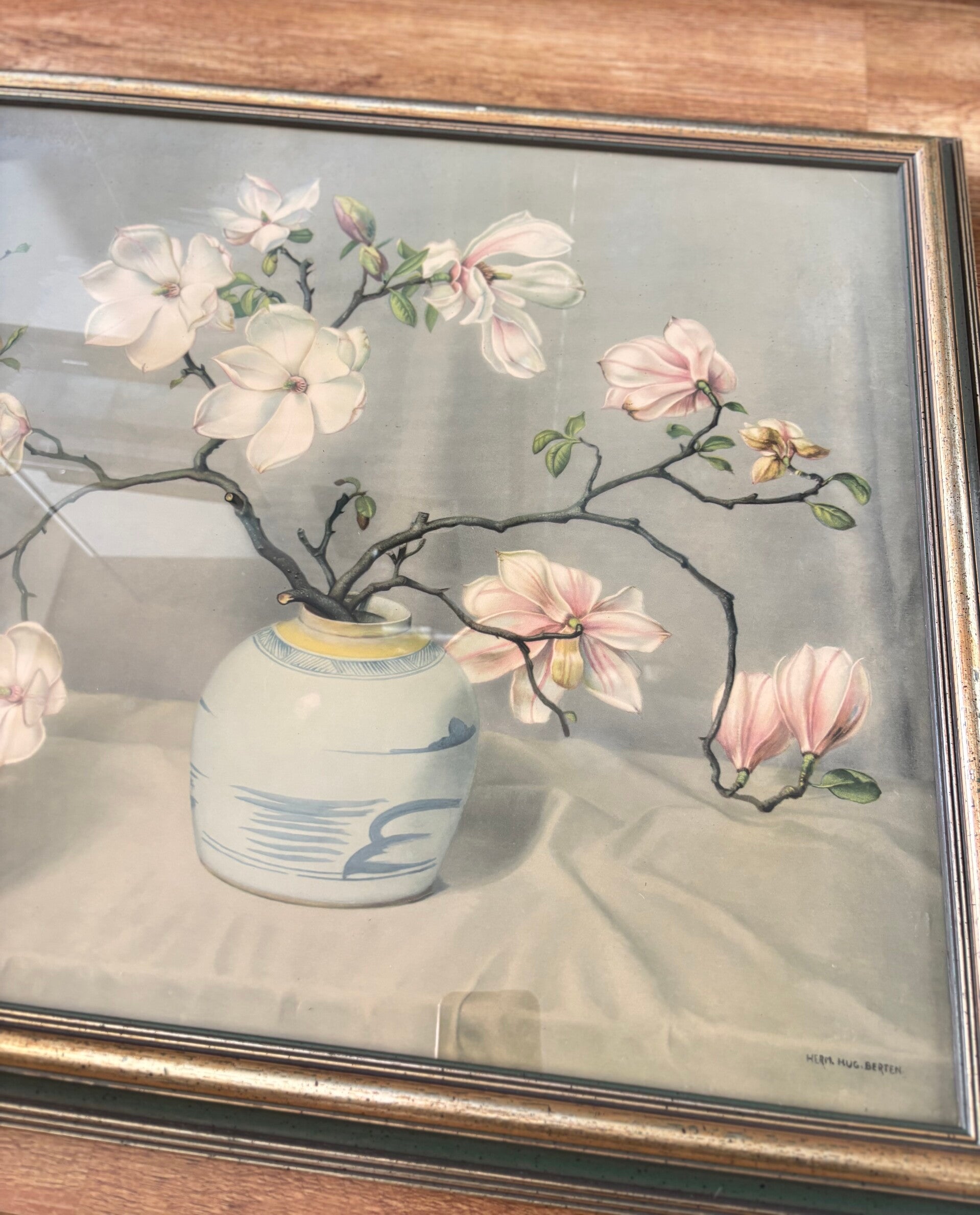 Prachtige prent met magnoliatakken in vaas van Herman Hugo Berten. Afkomstig uit begin 1900-1930. De prent is in 1997 ingelijst bij een kunsthandel in Doetinchem. Door het glas is het lastig een foto te maken. De lijst heeft op 2 plekken hele kleine vintage oneffenheden.