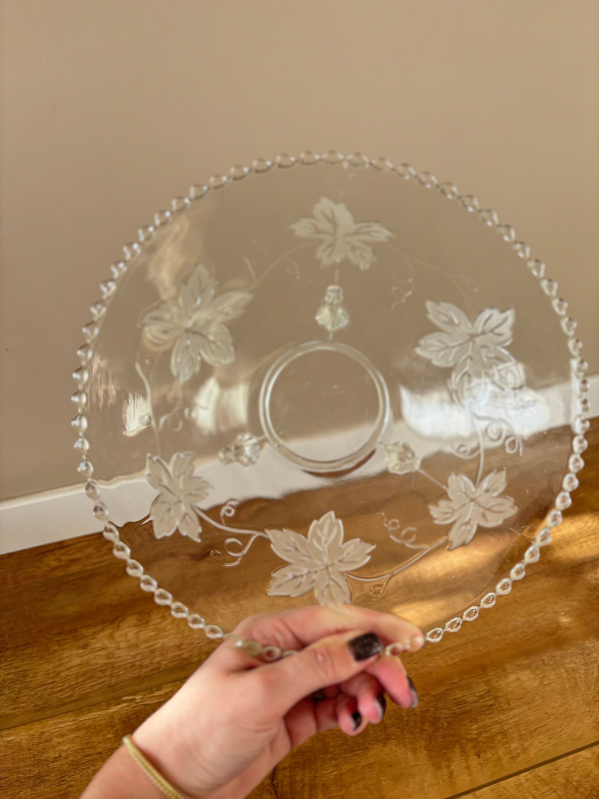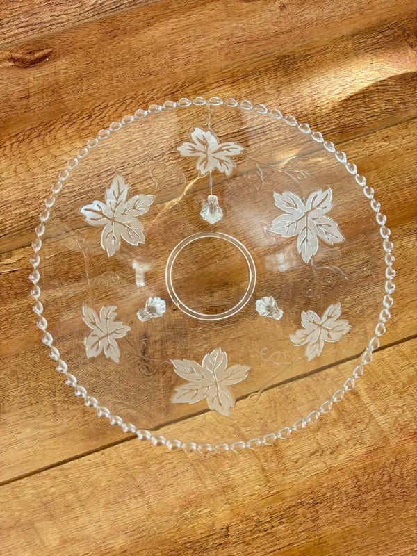 Glazen serveerschaal met bladeren verwerkt in het glas. De bladeren zijn aan de onderkant op het glas verwerkt. De bovenkant is glad. De schaal staat op 3 pootjes en heeft een mooie rand. Wat wil je nog meer 😍!