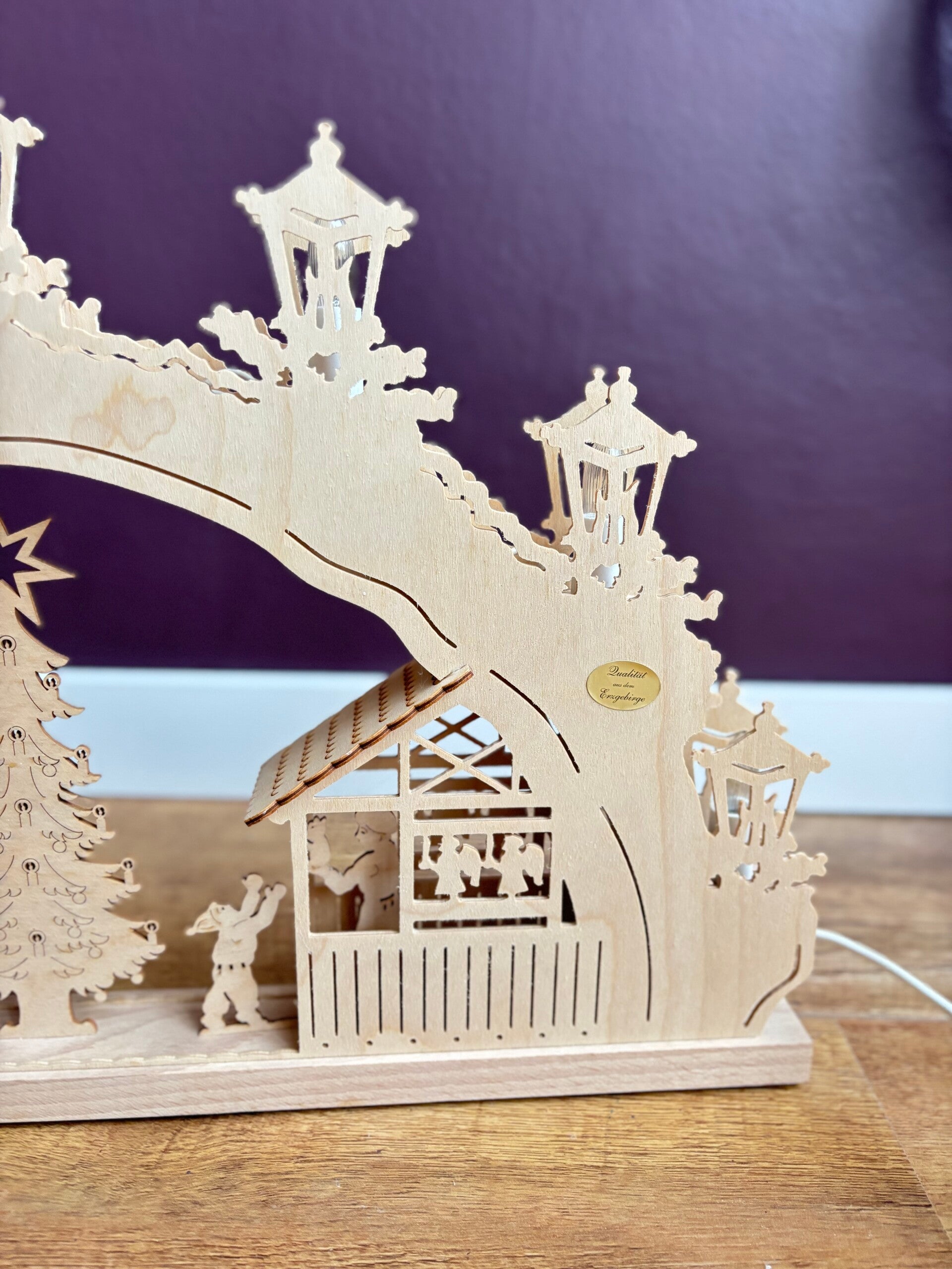 Prachtig handgemaakt en houtgesneden kersttafereel van een 'Weinachtsmarkt'. Afkomstig uit het Ertsgebergte. De lampjes schijnen tussen het hout door. Wat een mooi plaatje!