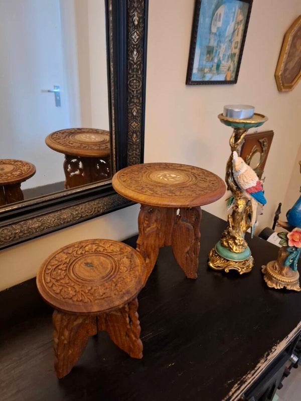 Indische houtsnijwerk bijzet tafeltjes. leuk om deze tafeltjes in huis te hebben. Ze leuken je woonkamer op. Prachtig staaltje houtsnijwerk. In goede Vintage staat met wat sporen van de tand des tijd.