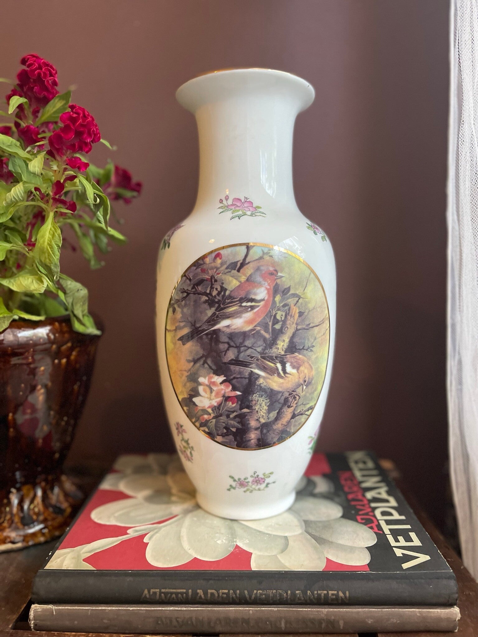 Prachtige porseleinen tempelvaas met vogelopdruk van vinken. Hoe leuk en afgewerkt met bloemen!♛ 42 cm hoog
