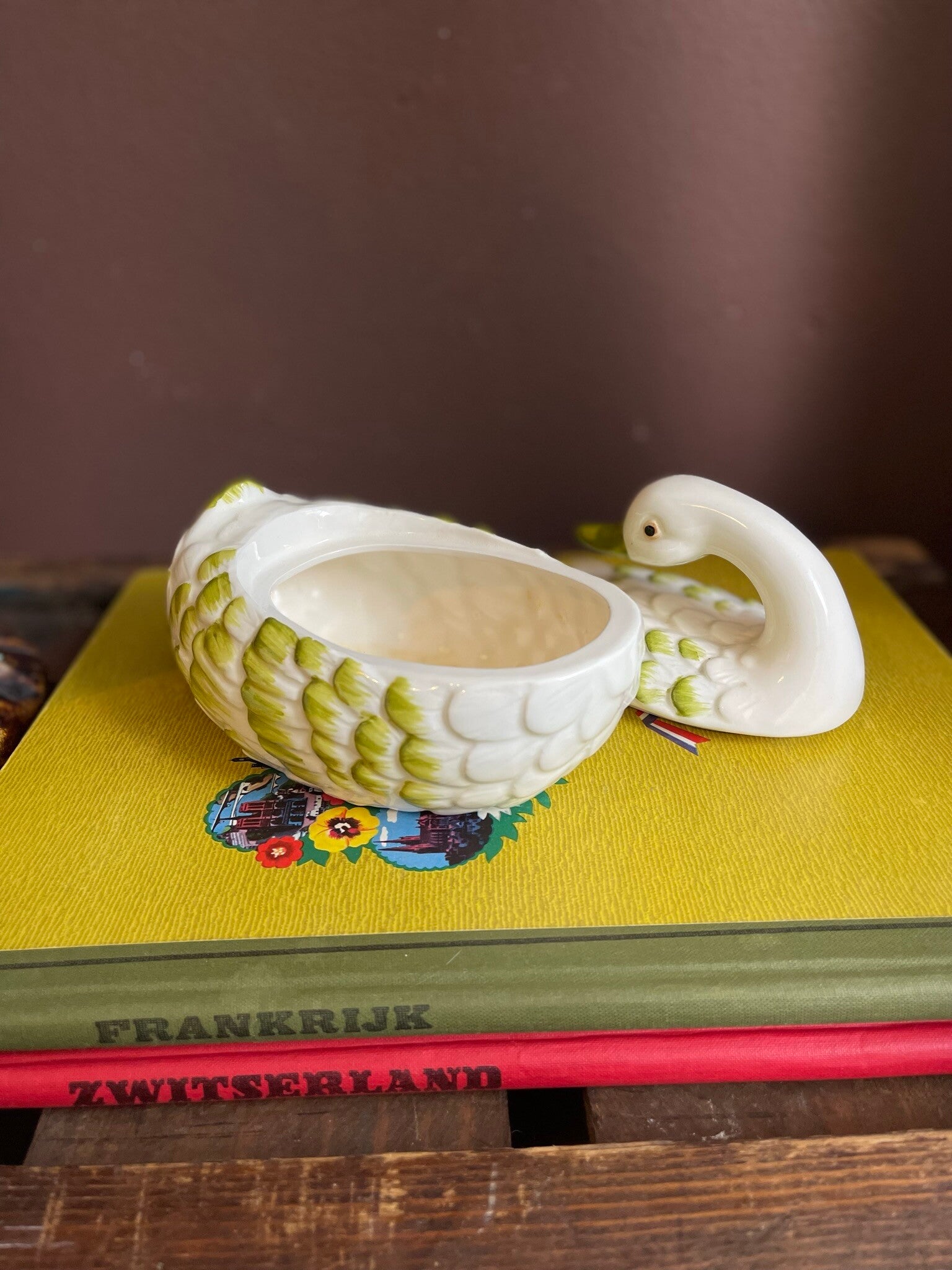 Kek groen eendenbakje, te leuk voor sieraden of kleine snuisterijen. De kleur groen is lekker fris en het bakje is een plaatje om neer te zetten.♛ 10 cm x 10 cm x 13 cm