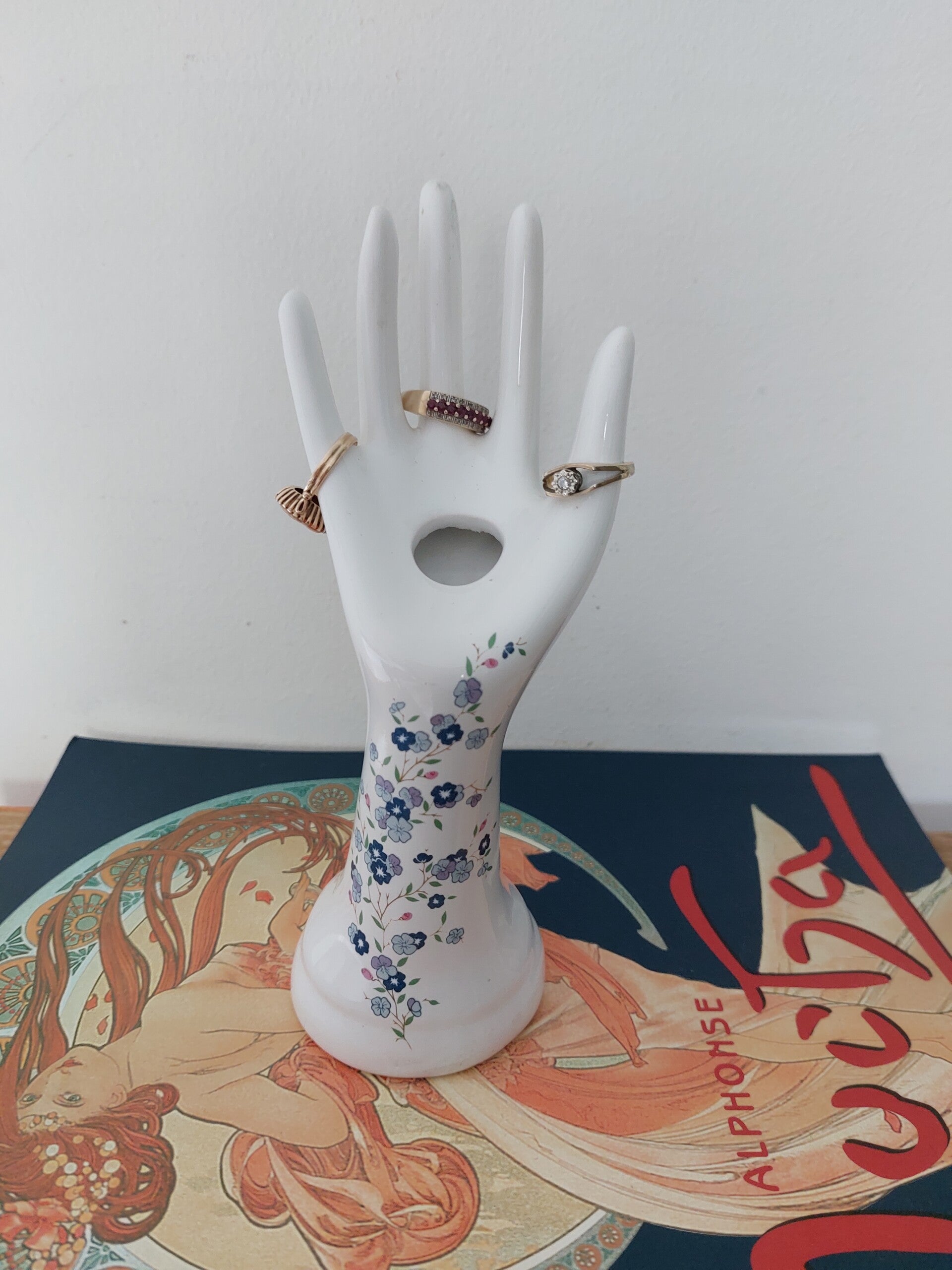 Mooi Vintage porselein ring vaasje. Gedecoreerd met blauwe bloemetjes. Leuk om je sieraden aan op te hangen maar ook te gebruiken als vaasje. How cute!