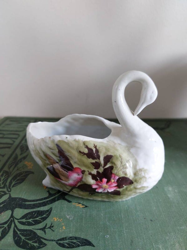 Wat een mooi porseleinen bloempotje in de vorm van een zwaan. Hoe leuk gedecoreerd met vrolijke bloemen en een vogeltje. Ook leuk om als sieraden bakje te gebruiken.