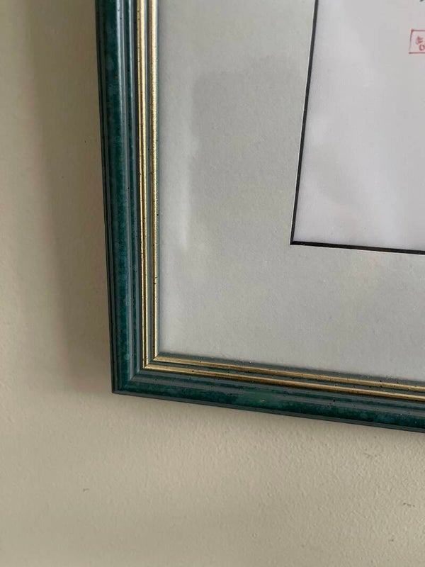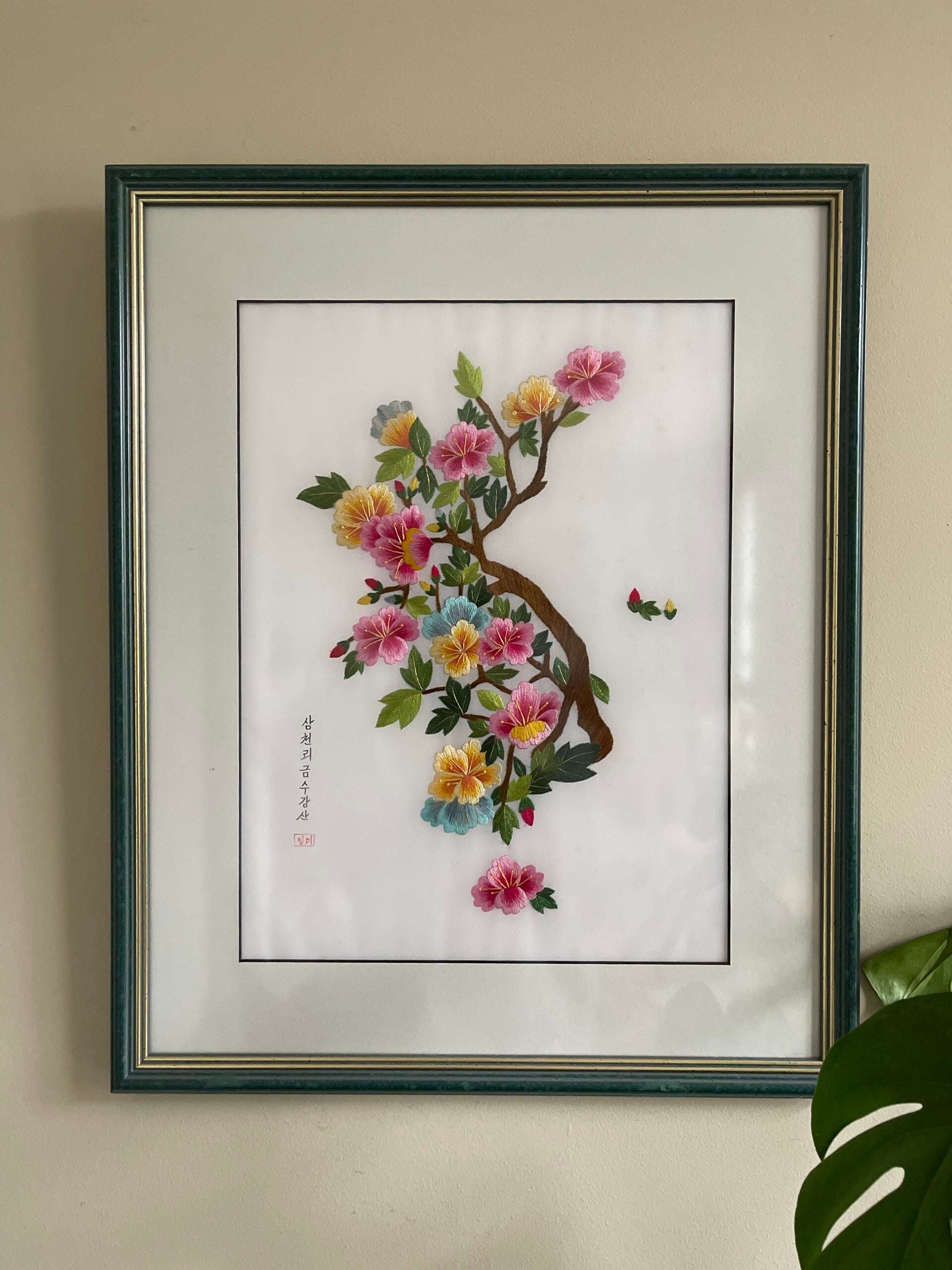 Mooi geborduurd schilderij op zijde. De bloemen en afgebeelde vorm geven de landsgrenzen van Korea aan. Gezet in mooie groene lijst.