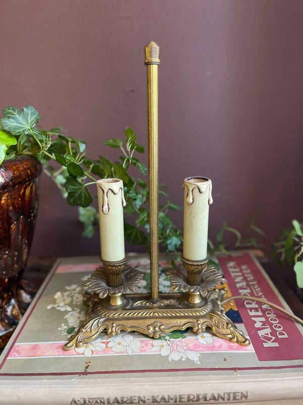 Vintage lampvoet met plek voor 2 lampjes. Kies voor kaarsvormige lampjes en dit lampje kan zo ergens gestyled worden! De gouden kleur en bewerking maakt het lampje een ware eyecatcher.